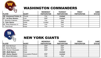 The Washington Commanders are prepating for their Week 2 matchup against the New York Giants with a few players dealing with injuries. Emmanuel Forbes Jr injured his thumb after the Week 1 loss to the Buccaneers. He was a full participant in yesterday’s practice, but he was limited today. Ian Rapport reported that Forbes is having surgery tomorrow for a torn UCL in his thumb. Dan Quinn had said Forbes would play with a splint on Sunday, but he is now likely out for at least this game. The teM didn’t place him on injured reserve, and will make a decision after surgery.