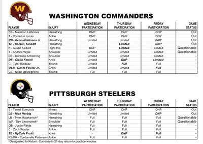 Brian Robinson Jr will miss his second game for a hamstring injury. Dan Quinn talked about regaining confidence in the leg before being able to go full in practice. He’ll have a short week for Thursday night’s game against the Philadelphia Eagles to try to go again.
