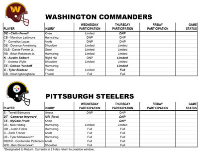 Kicker Austin Seibert scared some fans yesterday when his name appeared on the injury report with a right hip injury. He returned to the practice field today, but was limited. That’s an improvement, but if Seibert has a setback, Washington would likely have to sign a kicker to their practice squad to have available for the Steelers game.