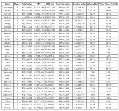 The other angle to look at with the draft is how much value is created in the process which shows how much rookies are underpaid. The Commanders picks project to add the equivalent of $87 million in value per year despite the cost of just $21.7 million per year. Chicago, New England, and Arizona all added over $70 million in value to their teams via the draft.
