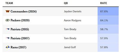 Washington has scored on 68 percent of its drives, the highest rate through four games for any team since at least 2000, per TruMedia. You might recognize the teams right behind the Commanders on that list. Not even Brady’s 2007 New England Patriots scored this frequently to start their historic unbeaten regular season.