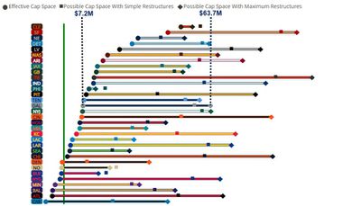 This table shows where teams are now in terms of cap space (circle) and their possible cap space with the maximum restructures employed (diamond). The Cowboys have the potential to go from $7.2 million in cap space to $63.7 million, freeing up an additional $56.5 million. You may notice that the Philadelphia Eagles and Cleveland Browns have very little restructuring capability while a team like the Tampa Bay Buccaneers have plenty of flexibility.
