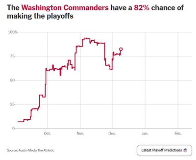 The Athletic’s projections give the Commanders an 81.7 percent chance of qualifying for the postseason. There’s no definitive formula beyond winning the remaining four games, but a 2-2 finish would likely be enough. Anything less, and we’re talking about a potential disaster finish for an underdog team that surprisingly began the season winning seven of nine.