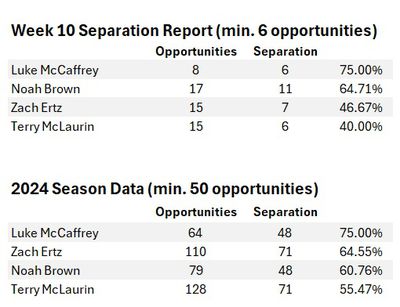 Separation percentage measures how often a receiver beats the coverage to get open rather than benefiting from a defense more focused on limiting yards after the catch or stopping them short of the first down.