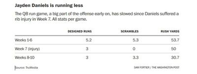 Over the past three weeks, Daniels hasn’t run as often or as efficiently as he did to start his pro career, when his scrambles fueled the offense’s success. Some of the drop-off is intentional — the team has called fewer designed runs since he hurt his ribs Oct. 20 — and some of it is how defenses have schemed to pen Daniels in the pocket.