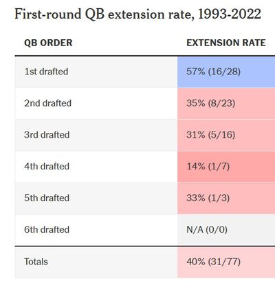 The rate was about the same when the second quarterback in a class was chosen No. 2 overall, as Daniels was by Washington (two of seven re-signed in that case, with one of the re-signings, Carson Wentz, becoming regrettable as his career trajectory suddenly tanked). Italics below identify the seven quarterbacks chosen second overall.