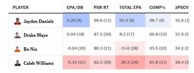Again, the door for Nix might have gone from shut to ajar — per Pro Football Focus, Nix has splashed 12 big-time throws to Daniels’ 11, while both QBs have recorded six turnover-worthy plays, leading to a turnover-worthy play rate of 1.6 percent for Daniels and 1.5 percent for Nix — but it’s not been kicked wide open yet. Daniels still has far more positives. For the season, Daniels has generated 67.1 total EPA and 0.18 EPA per dropback. Nix sits with marks of -34.2 and -0.08, respectively. Nix has one game with more than a 0.10 EPA per dropback (Sunday against Atlanta, when he posted 0.61). Daniels has eight such games, with a high of 0.68 in the win over Cincinnati. In games he’s finished, Daniels has produced a negative EPA per dropback just twice. Nix has done it five times.