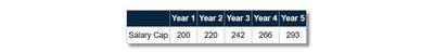 Allow me to illustrate the principle with some simple numbers. For simplicity’s sake, let’s assume the salary cap is $200 million. Let’s further assume that the cap will increase by 10% every year (the principle works with any percentage, but it needs the cap to increase every year). Here’s what such a cap development would look like over a five-year period: