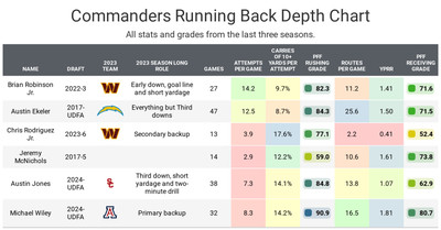 “Dan Quinn is changing things in a big way for the [Washington] Commanders, and with a ton of new pieces in place, the running game is going to be a rookie QB’s best friend. Following a season in which [Brian] Robinson showed some exciting potential, 2024 could be the year he puts himself in the breakout category.”