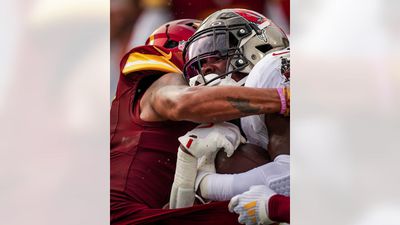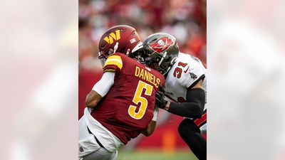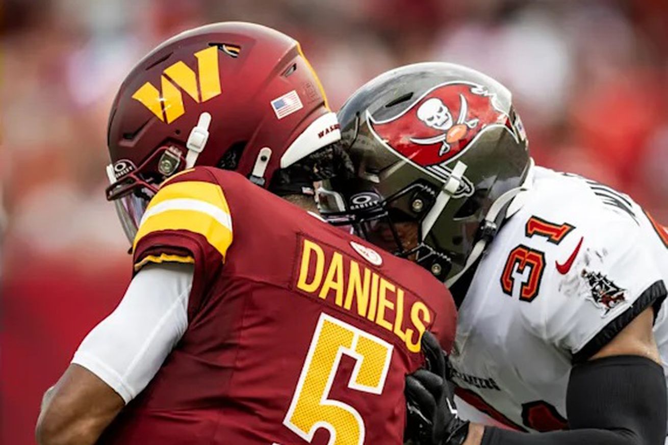 But, when the quarterback keeps taking off, it’s just a matter of time before he, and his team, pay a terrible price. In the second quarter, Daniels got got, taking a hit to the head by Buccaneers safety Antoine Winfield Jr. on an 11-yard scramble, a shot that knocked the quarterback’s helmet off. Daniels stayed in the game. It may not end so benignly next time.