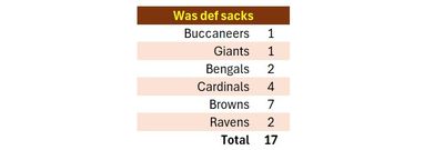 Washington ranks 9th in the NFL in sacks per game (2.8) and 2nd in the NFL over the past three games (13), but, in both cases, that is mostly due to a 7-sack performance against a hapless Browns offense led by a struggling Deshaun Watson.