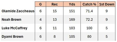 The argument for Brown is easy to fathom; as shown in the table reprinted from this week’s Reacts survey article, Noah Brown leads the other three receivers in receiving yards gained, and he’s managed that while playing two less games. Noah Brown has played just 4 games this season, while the other receivers have played 6 games each.
