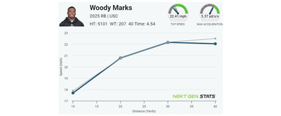 With the ability to benefit the running and passing game, Woody Marks is an interesting prospect. His patience and vision make him a fit for a zone blocking scheme, while his ability to set up blocks should allow him to succeed in gap schemes. Quick acceleration allows him to burst through holes and create separation as a receiver. Strength is a weakness in his game as it hurts him when he tries to break tackles, run through defenders, and block. His skillset makes him a good change of pace from Robinson while giving the team a reliable receiving threat that consistently gains positive yards. Marks could be a good fit for the Commanders as a RB2.
