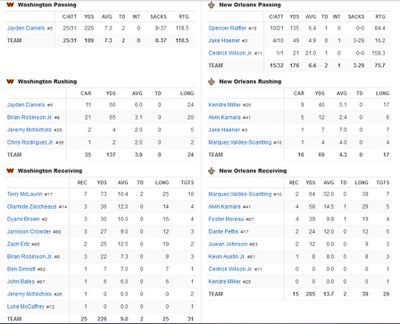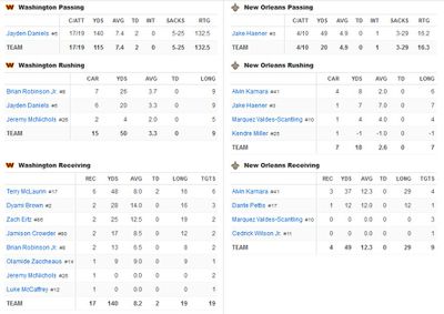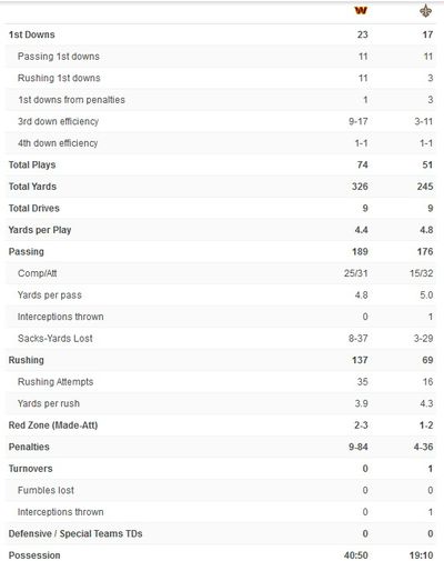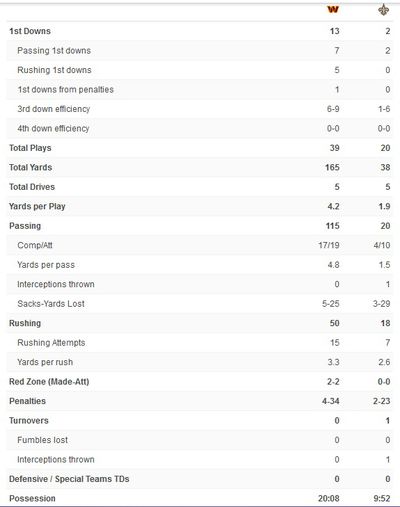Washington has 10 first downs; New Orleans has 1. Commanders are 5-7 on 3rd down conversions; NO is 0-3. Total yards, 147 for WAS, 25 for NO. Passing yards, 105 for WAS, 9 for NO. Rushing, 42 yards for WAS, 16 for NO.