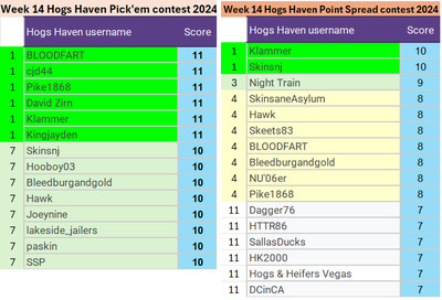 There were 43 entrants in this weeks Pick’em contest, down slightly from last week’s total of 46. With 13 games on tap in Week 14, we had 6 entrants — BLOODFART, cjd44, Pike1868, David Zirn, Klammer, and Kingjayden — tie for the best score of the week in picking winners, with 11 correct predictions each. Another 8 entrants correctly predicted 10 games each.