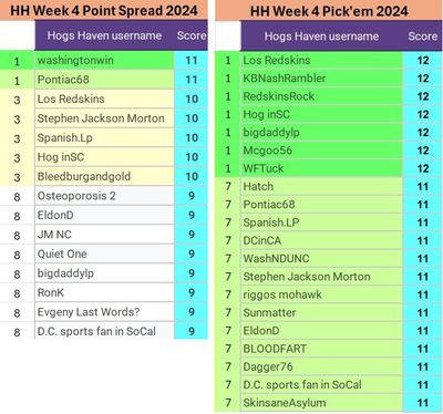 We had 36 entries in the Point Spread contest (up from 33 entries last week) and ended up with a tie at the top between washingtonwin and Pontiac68, who each correctly predicted 11 out of 15 games (Falcons-Saints game was a push). I’m unilaterally declaring washingtonwin the winner of the week because he correctly picked the Commander to cover the spread, while Pontiac68 went with the Cardinals. There was a logjam behind them with 5 entrants correctly predicting 10 outcomes against the spread.