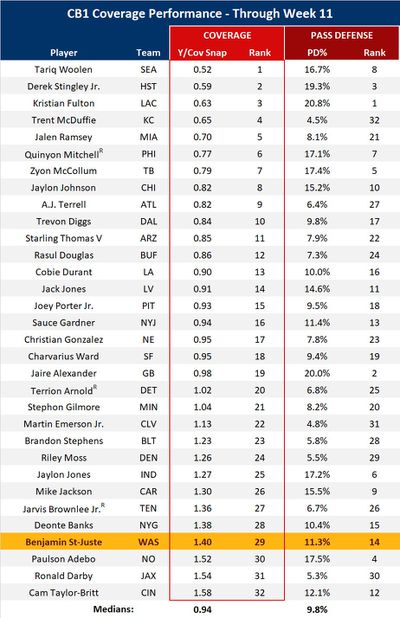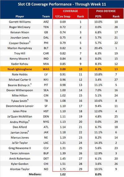 Perhaps the biggest surprise from the coverage numbers is how well career special teamer and backup Noah Igbinoghene has performed in his first season starting at Slot CB. The Commanders might have some difficult decisions to make this offseason.