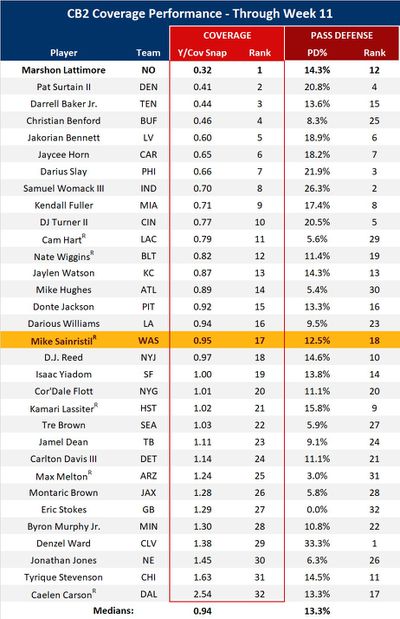 All NFL primary starting CBs were ranked based on their overall performance in coverage based on Receiving Yards/Coverage Snap (Y/Cov Snap). The intention was to compare each of Washington’s starting CBs to the other starters in the same roles.