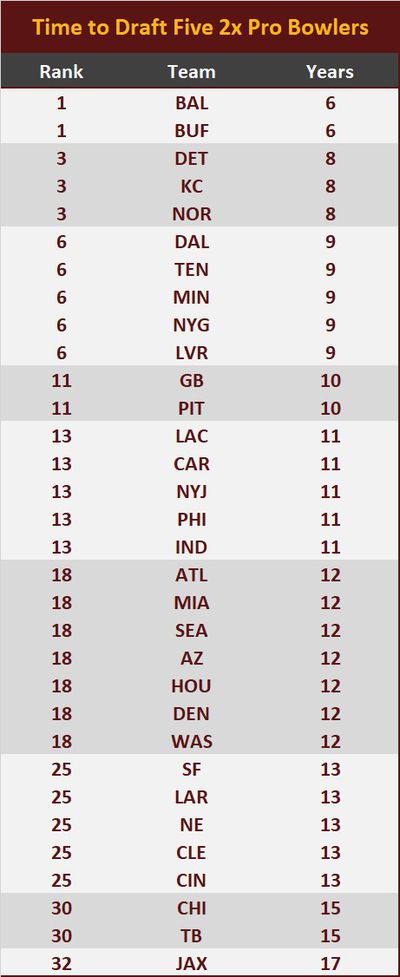 To provide a more inclusive view of premium talents, I also ranked teams based on the time it took them to draft their last five players who earned two or more Pro Bowl nominations.