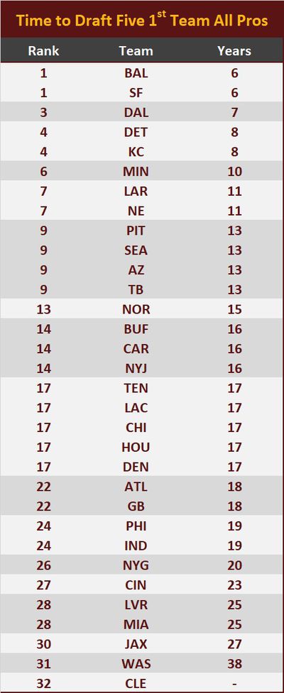 As we might have suspected, Washington is ranked in a distant 31st place, taking 11 more years to draft their fifth AP1 than the Jaguars, ranked one place ahead of them. The Redskins, as the team was known 38 years ago, might only have avoided ranking last on a technicality. The team currently known as the Cleveland Browns is an expansion team, which began playing in 1999. The original Browns moved to Baltimore and became the Ravens in 1996. The new Cleveland Browns have only drafted four firstteam All-Pros in their 25 year franchise history.