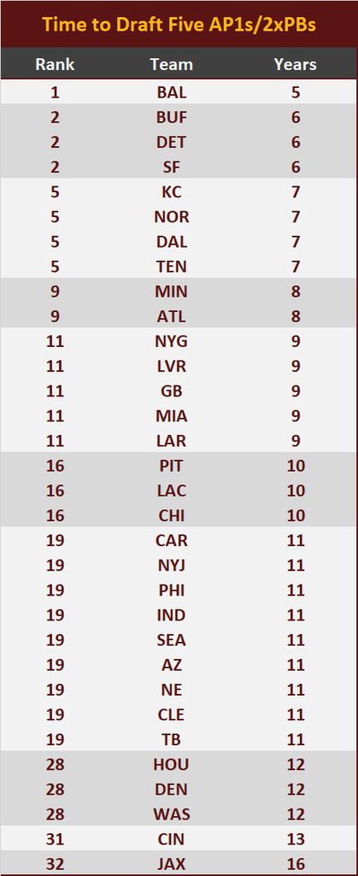 Time to draft the last five elite players was calculated as the difference between the draft year of the fifth most recent elite player and 2023. That might be considered as deflating all the times by 1 year, or treating 2023 as year 0. No team drafted five AP1s or 2x Pro Bowlers in 2023, so it’s not really an issue. The main point is all teams were measure in exactly the same way.