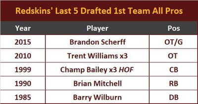 I knew that the last time that Washington had drafted a first team All-Pro was when Scot McLoughan selected OT Brandon Scherff fifth overall in 2015. They haven’t drafted a lot in the last two decades. That made me wonder how far back I’d have to go to find five first team All-Pros drafted by the Redskins. This is what I found:
