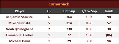 Commanders’ players were ranked against 96 CBs who played a minimum of 125 coverage snaps. Key Y/Cov Snp values from this sample are: