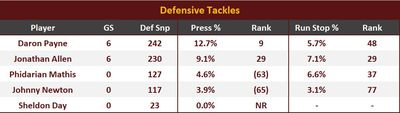 Payne ranks 9th among the top 80 iDL in pressuring the QB, with 19 pressures on 150 pass rush snaps. Jonathan Allen has been less disruptive up front, but still ranks at the 64th percentile of iDL in generating pressure. Allen also ranks 29th out of 93 iDL at stopping the run.