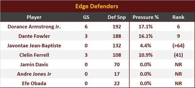 Rookie DE Javonte Jean-Baptiste has only generated pressure on 4.4% of pass rush snaps, which is lower than the lowest-ranked starter. However, he has sacked the QB, which is actually kind of special for a seventh round draft pick.