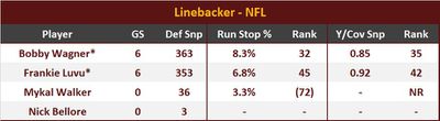 Wagner ranks above average among 79 LBs in run defense, and was also above average of 85 LBs in pass coverage.