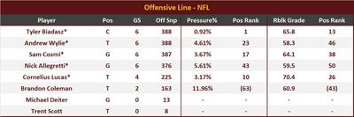 Offensive linemen are responsible for pass protection and run blocking. Run blocking performance was ranked using PFF grades, as with tight ends. Performance in pass protection is more readily quantifiable using Pressure Rate, defined as the percentage of pass blocking snaps on which the blocker allowed a pressure (QB hurry, QB hit, sack).