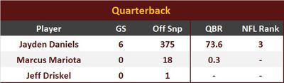 QB is the one position on an NFL roster with a really good, all-inclusive performance metric. To compare Jayden Daniels’ performance to his peers, I used ESPN’s Total QBR. QBR is frequently confused with the NFL official stat Passer Rating, which is only based on passing stats. QBR is derived from EPA/play, and measures how effective the QB is at advancing his team toward scoring on a play by play basis. Unlike Passer Rating, it reflects most every aspect of QB play, including passing, running and negative plays, like sacks and fumbles. The only thing it really misses is run blocking.