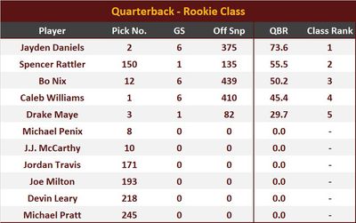 To date, five rookies have played at least one full game at QB. At this point in the race, Jayden Daniels has an enormous lead over second placed late entrant, Spencer Rattler, who played surprisingly well in two starts against the Bucs and Broncos. Caleb Williams got off to a slower start than Jayden, but has started looking like a first overall pick in his last three wins over the Rams, Panthers and Jaguars.
