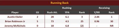 Lead back Brian Robinson Jr is also an above average rusher, ranking 25th in YPA among 65 starters and major contributors. His receiving productivity has been a little below average through the early part of the season, ranking 25th among RBs with enough receiving activity to start to get a handle on performance.