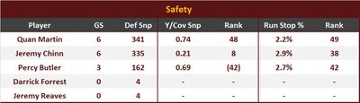 Performance of the Commanders’ safeties in coverage and run defense was evaluated using the same stats as other positions.