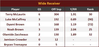 Olamide Zaccheaus is third WR on the team in total receiving yards (151) and is only slightly behind McLaurin in receiving productivity on an opportunity adjusted basis, at 1.89 Y/RR. He is also well above average in Y/RR among teams’ top-3 WRs, ranking 32nd among 96 WRs.