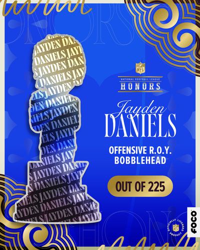 Jayden Daniels was voted the Pepsi Zero Offensive Rookie of the Year and the AP Offensive Rookie of the Year over the last two days. He received 49 of 50 1st place votes in the AP poll, and set the record for Pepsi Zero Offensive Rookie of the Week Awards during the season with 11. He also led the Washington Commanders to the NFC Championship game, falling just one game short of the Super Bowl, and the chance to be the first rookie QB to start in one. Our friends at FOCO have created a new Jayden Daniels OROY bobblehead that is available for pre-order now. This is another limited run.