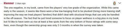 Of course, these 5 areas addressed in our survey are neither comprehensive nor particularly granular. The views of fans are certainly broader and more nuanced than can be captured with 3 close-ended questions. Let’s look at some of the comments that accompanied this week’s survey article.
