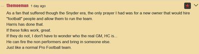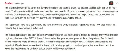 Involvement in the process of running the team is a touchy subject in Washington. A huge issue with the former owner was that he imposed his own will on the football people he had hired, often with terrible results. As a result, any mention of owner involvement tends to trigger a certain portion of Washington fans. Harris seems to have, so far, carefully walked the line between being very involved with the team and learning more about the NFL and being a ‘meddling’ owner. While some people were concerned that Harris was part of the search committee for the team’s head coach, it would have been unreasonable to expect otherwise. However, many more people saw red flags waving when it was reported that Harris was sitting in on Combine interviews with the top 6 quarterback prospects. Concerns seemed to be mostly quelled when further reporting revealed that Harris was basically just in the room and observing as part of his self-orientation to the NFL, and that he was not actually part of the interview process. Still, for some fans, a Combine interview room was clearly not where they wanted to see the owner.
