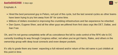 The new stadium is one of the most obvious issues. Clearly, one of the most urgent requirements for the new Washington owner is to secure a site, design a stadium, arrange funding, and build something that will be good for players and fans. With Harris not quite into his 8th month of ownership, this can only be seen as an “incomplete”, but with most voices saying that the best outcome would be a return to DC, the political developments over the past year should be seen as a clear sign that there will be good options available to the Harris group as they get to the point in the coming year when they can probably make a firm commitment to which piece of land will be the home of the team in the coming decades.
