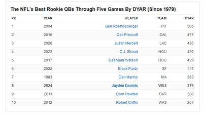 3. Jayden Daniels ranks eighth in value among rookie quarterbacks through five starts