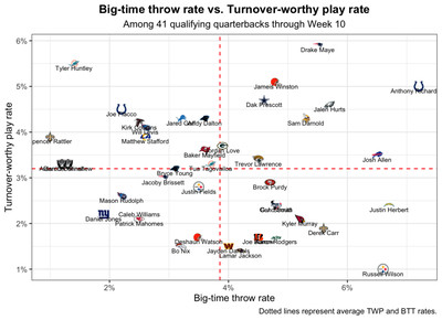 • The top right: Quarterbacks with high big-time throw and turnover-worthy play rates, those who “live by the sword and die by the sword.”