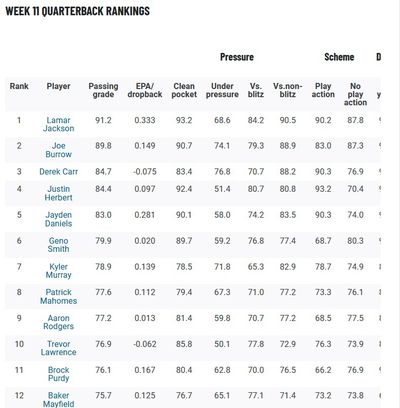 In this quarterback rankings breakdown, we’ve evaluated the top performers based on PFF passing grades. Using insights from Premium Stats, we’ll also present a variety of key grades beyond passing grade, including grades under pressure, from a clean pocket, against the blitz and more.
