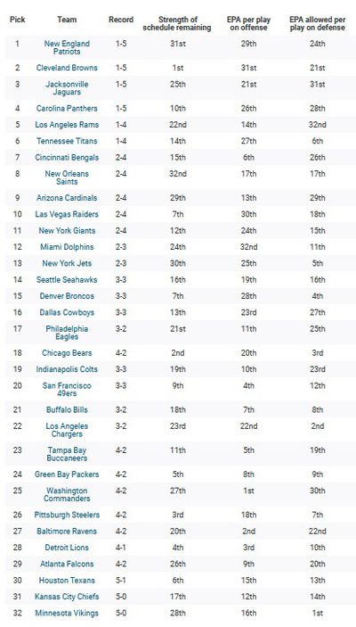 Included below is the projected draft order after Week 6, incorporating each team’s remaining strength of schedule (1st is hardest), along with their ranks in EPA per play and EPA allowed per play to give a full picture of the current landscape.