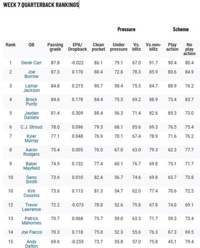 In this quarterback rankings breakdown, we’ve evaluated the top performers based on PFF passing grades. Using insights from Premium Stats, we’ll also present a variety of key grades beyond passing grade, including grades under pressure, from a clean pocket, against the blitz, using play action and more.