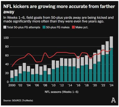 Through the first six weeks of the season, we have seen all-time highs in 50-plus-yard field-goal attempts (103), along with makes (77) and conversion rate (74.8 percent). Since 2019, kickers have nearly doubled their attempts from 50-plus (55) and tripled their makes (29) in the opening six weeks.