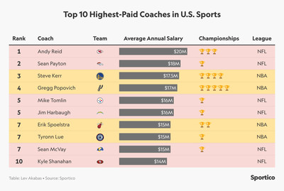 The exits and a slew of new contracts meant a 50% turnover at the top of Sportico’s annual study of the highest-paid coaches in American sports and a new No. 1 in Andy Reid, replacing Belichick. In April, the Kansas City Chiefs rewarded Big Red with a five-year, $100 million contract following back-to-back Super Bowl titles and three in five years. Reid is the only NFL coach to win 100 games with two franchises, and he is on his way to a 20th playoff appearance in 26 seasons coaching the Chiefs and Philadelphia Eagles.
