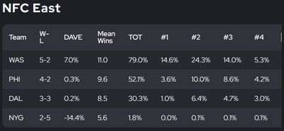 The NFL playoff picture odds report plays out the season 25,000 times. A random draw assigns each team a win or loss for each game. The probability that a team will be given a win is based on an equation which considers the DAVE ratings of the two teams as well as home-field advantage. (DVOA ratings are explained here.)