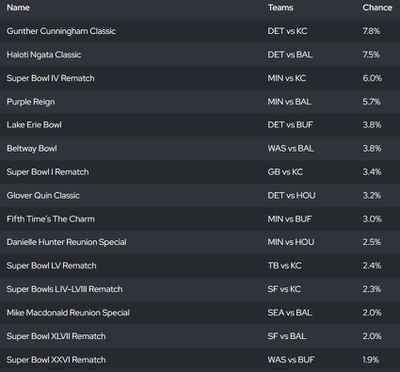This report lists the odds of several “special” Super Bowl matchups. Not all possible Super Bowls are included.