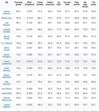In this quarterback rankings breakdown, we’ve evaluated the top performers based on PFF passing grades. Using insights from Premium Stats, we’ll also present a variety of key grades beyond passing grade, including grades under pressure, from a clean pocket, against the blitz and more.